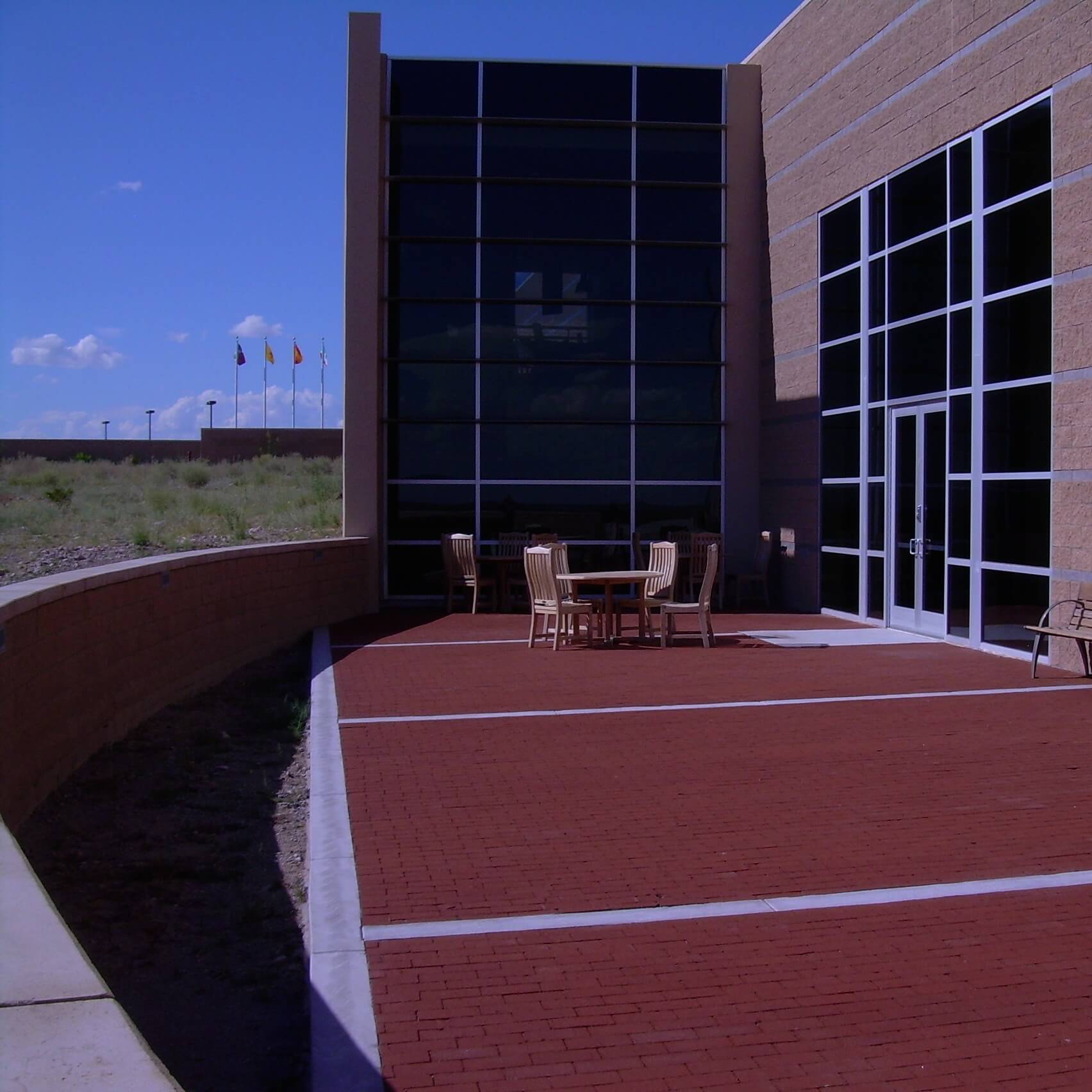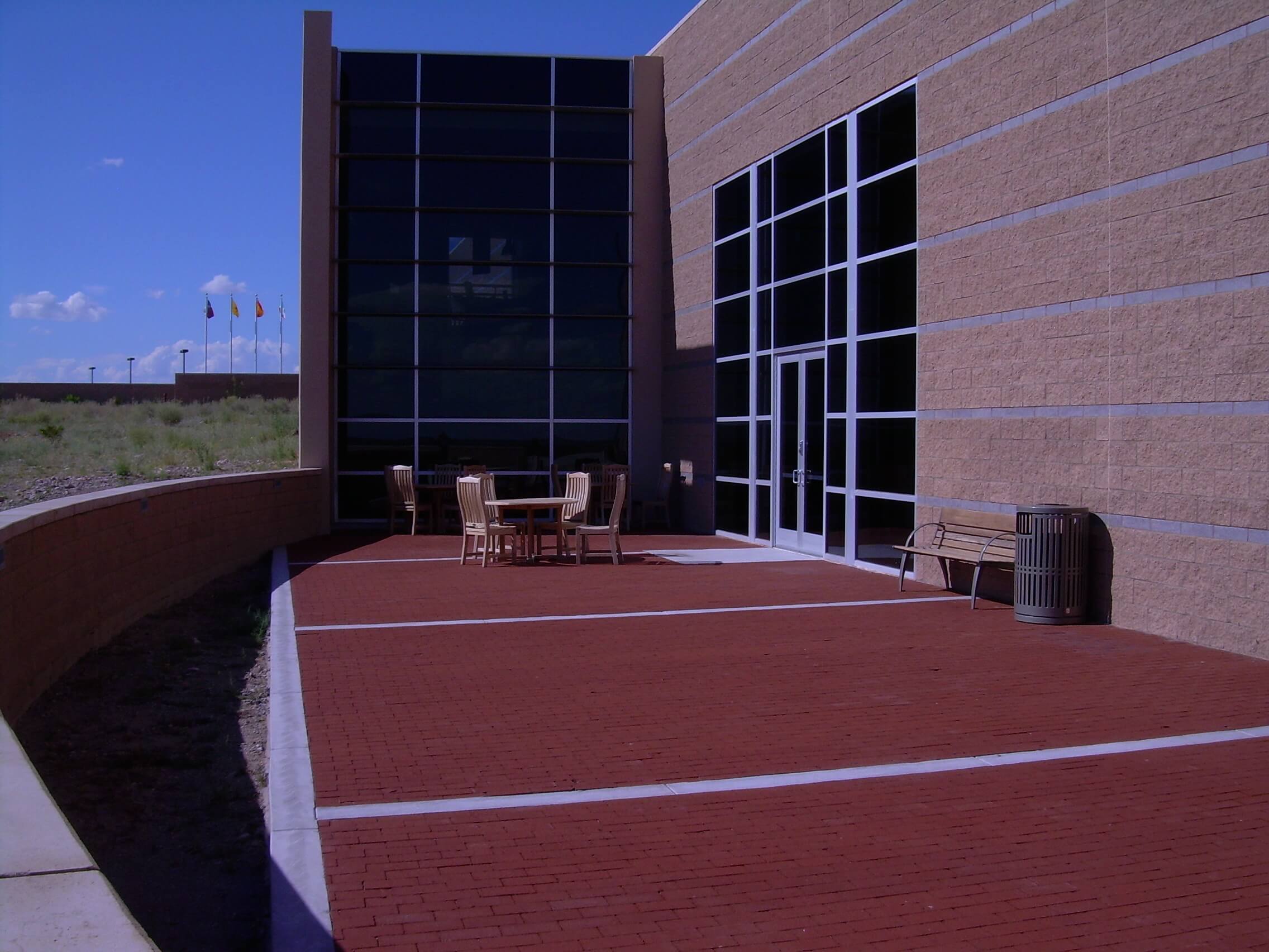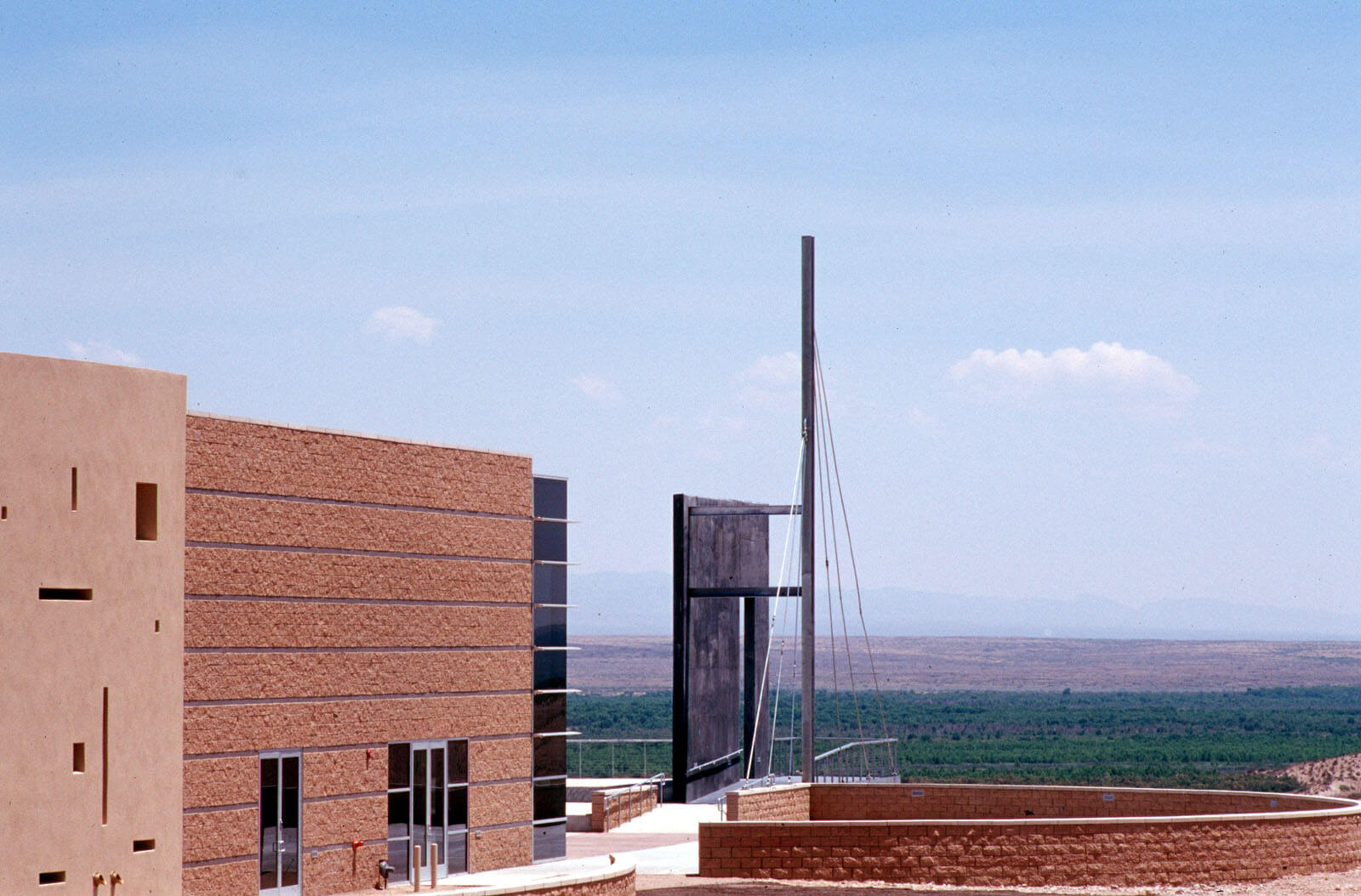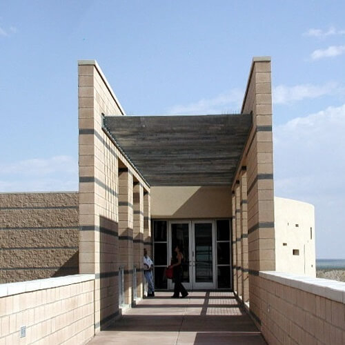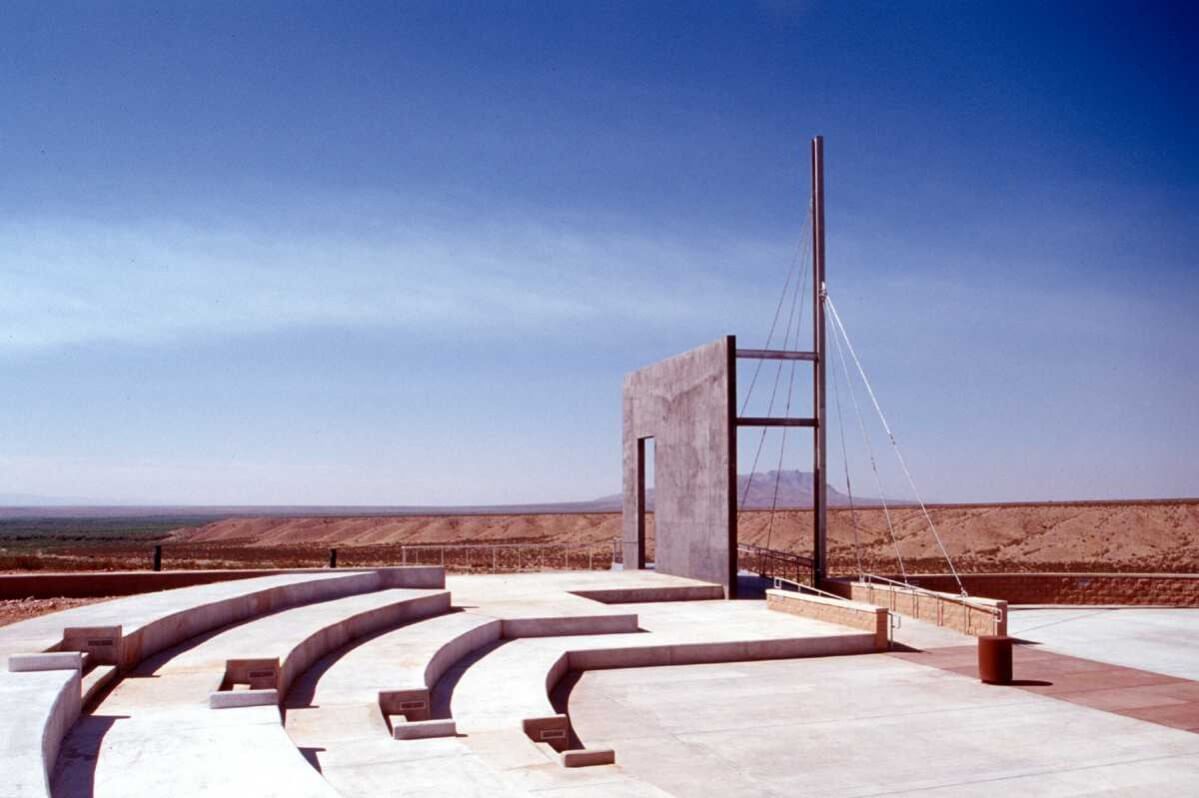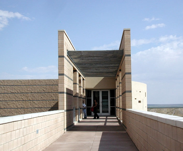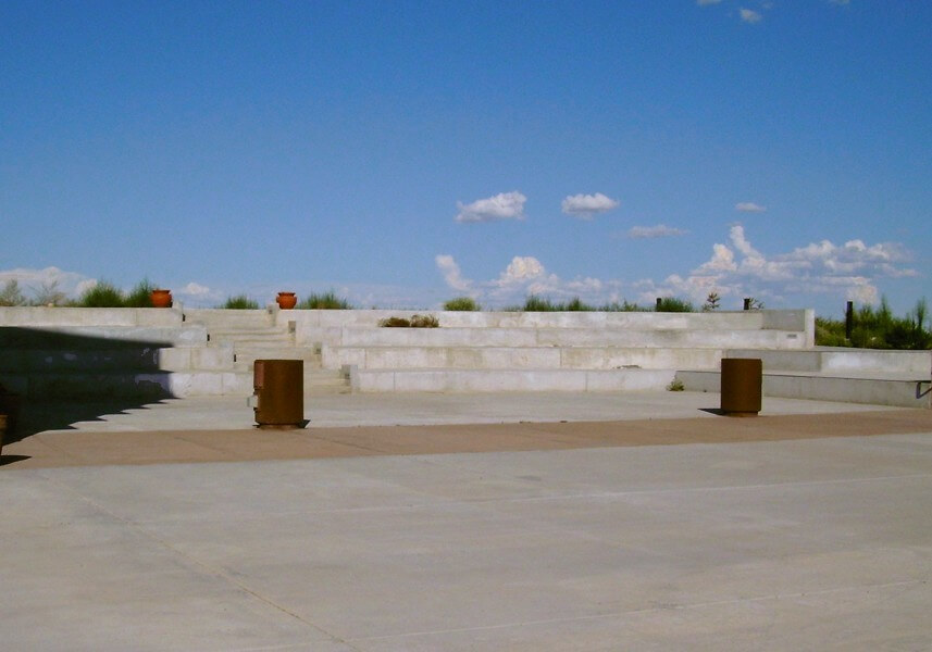 The wagon caravans, traveling the trail over the flat desert expanse of the Jornada del Muerto, were often described as looking like ships on the ocean. The El Camino Real Historic Trail Site was designed to be a ship that takes the visitor along El Camino Real. The entrance is the gangway to the ship; the building interior appears somewhat like a cruise ship, with visitors entering along the promenade deck to a stairway to the main deck. Outside the building to the east is the ampitheater, overlooking the vast Jornada del Muerto, a visitor stands as if standing on the bow of a ship, complete with a bow mast and observation deck.